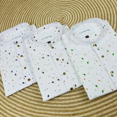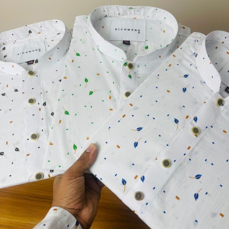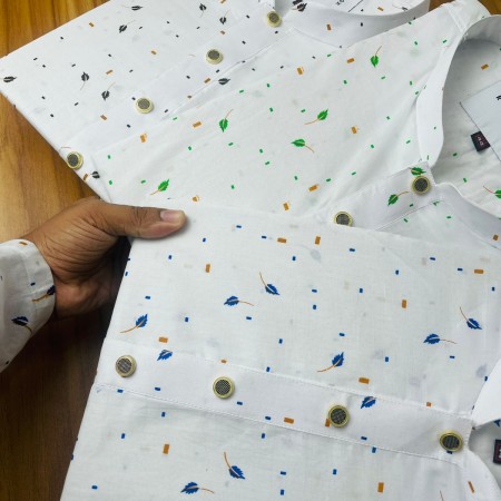 Experience comfort and style with this premium Pure Cotton Panjabi, designed with an elegant black leaf print on a crisp white base. The soft and breathable fabric keeps you fresh all day, while the metal-finish buttons and band collar add a refined, modern touch. Ideal for casual wear, office styling, weekend outings, and festive moments.